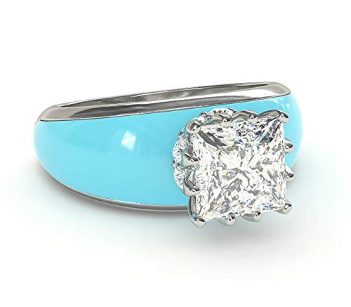 2.25 Carat Princess Cut Moissanite with Diamonds Engagement Turquoise Enamel Ring 14K White Gold (D-E VVS1)