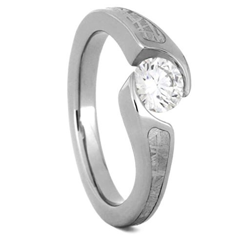Tension-Set Diamond with Widmanstätten Patterned Partial Gibeon Meteorite Inlaid on Each Side of the Shank; Flat Profile, Hypoallergenic, Comfort-Fit Titanium Engagement Band