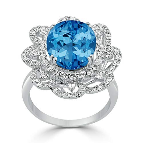 This beautiful Swiss Blue Topaz Gemstone and Halo diamond ring features 8 7/8ct oval-cut Swiss Blue Topaz Gemstone and 1 1/5ct TDW round-cut white diamonds on a gold band to create sparkle and fire at every angle. Crafted of 18k White Gold with a high-polish finish. Available in Sizes 5-8