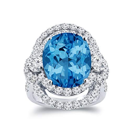 This beautiful Swiss Blue Topaz Gemstone and double halo diamond ring features 8 7/8ct oval-cut Swiss Blue Topaz Gemstone and 2 9/10ct TDW round-cut white diamonds on a gold band to create sparkle and fire at every angle. Crafted of 18k White Gold with a high-polish finish. Available in Sizes 5-8
