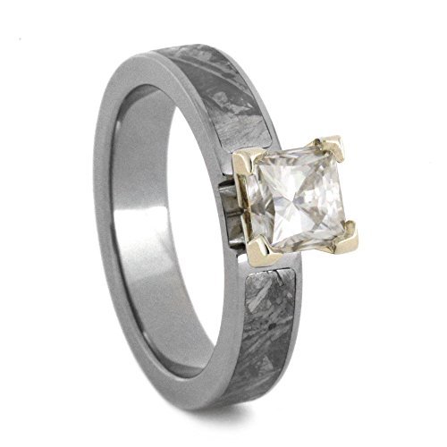 HAND-MADE, Comfort-Fit Titanium Band is Crafted with Princess Cut, 14k White Gold 4 Prong Set, Forever One Moissanite and Etched Gibeon Meteorite Inlay on a Hypoallergenic, Flat Profile Band