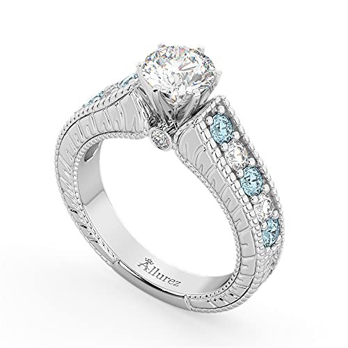 This vintage gemstone engagement ring setting showcases twelve round cut gems crafted in a platinum bead setting. The G-H Color, VS2-SI1 Clarity diamonds alternate with deep blue aquamarines.